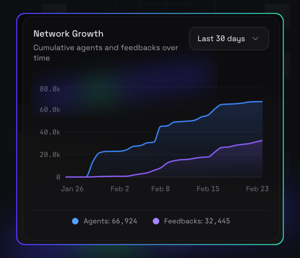 Over the last 30 days, the network shows strong cumulative growth in both agents and feedback activity.
